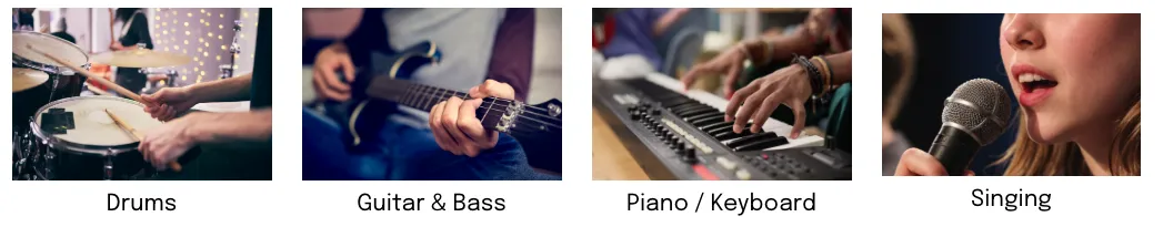 A: Core instruments include Drumset, Guitar, Bass Guitar, Piano/Keyboard, and Singing